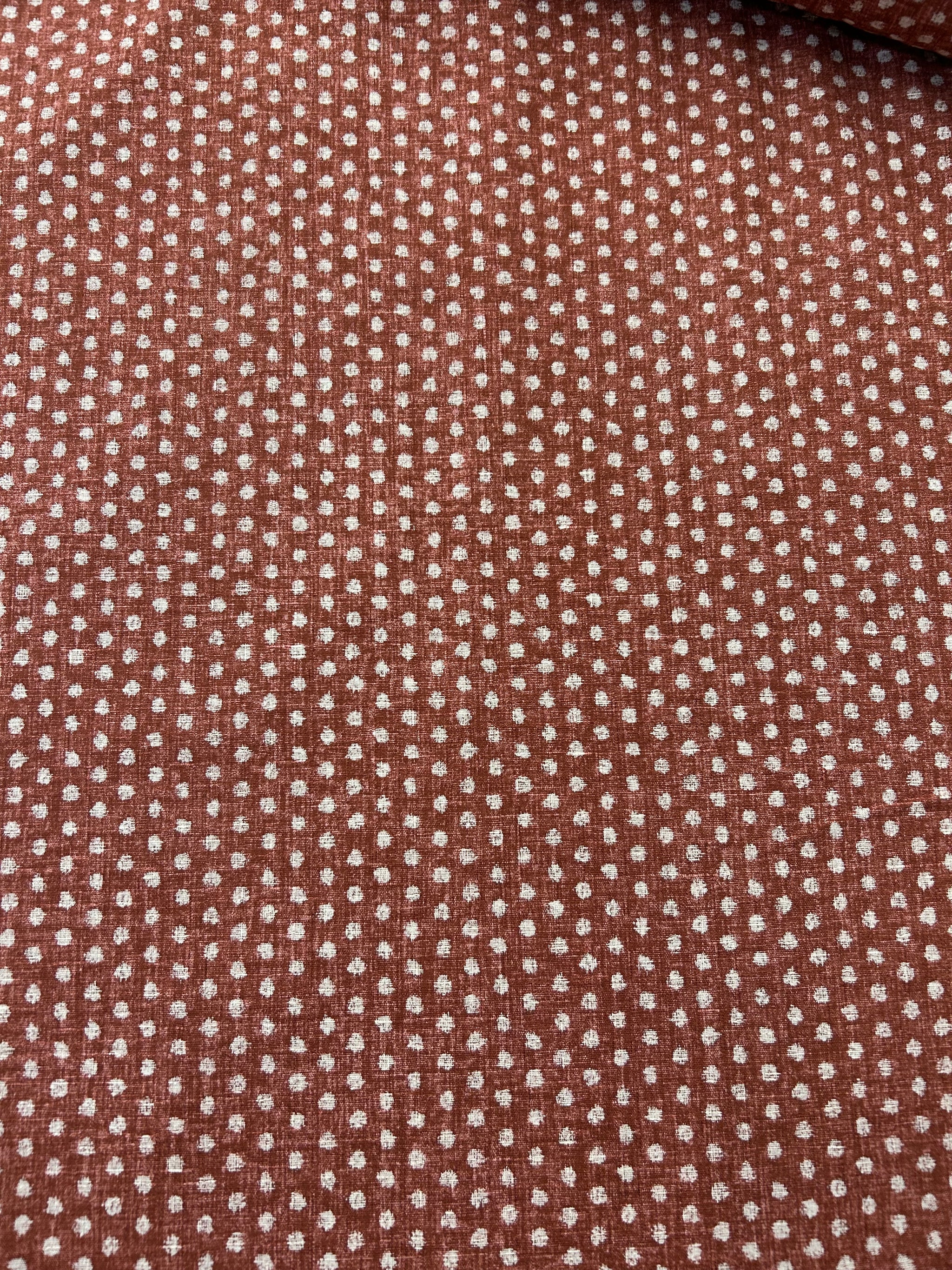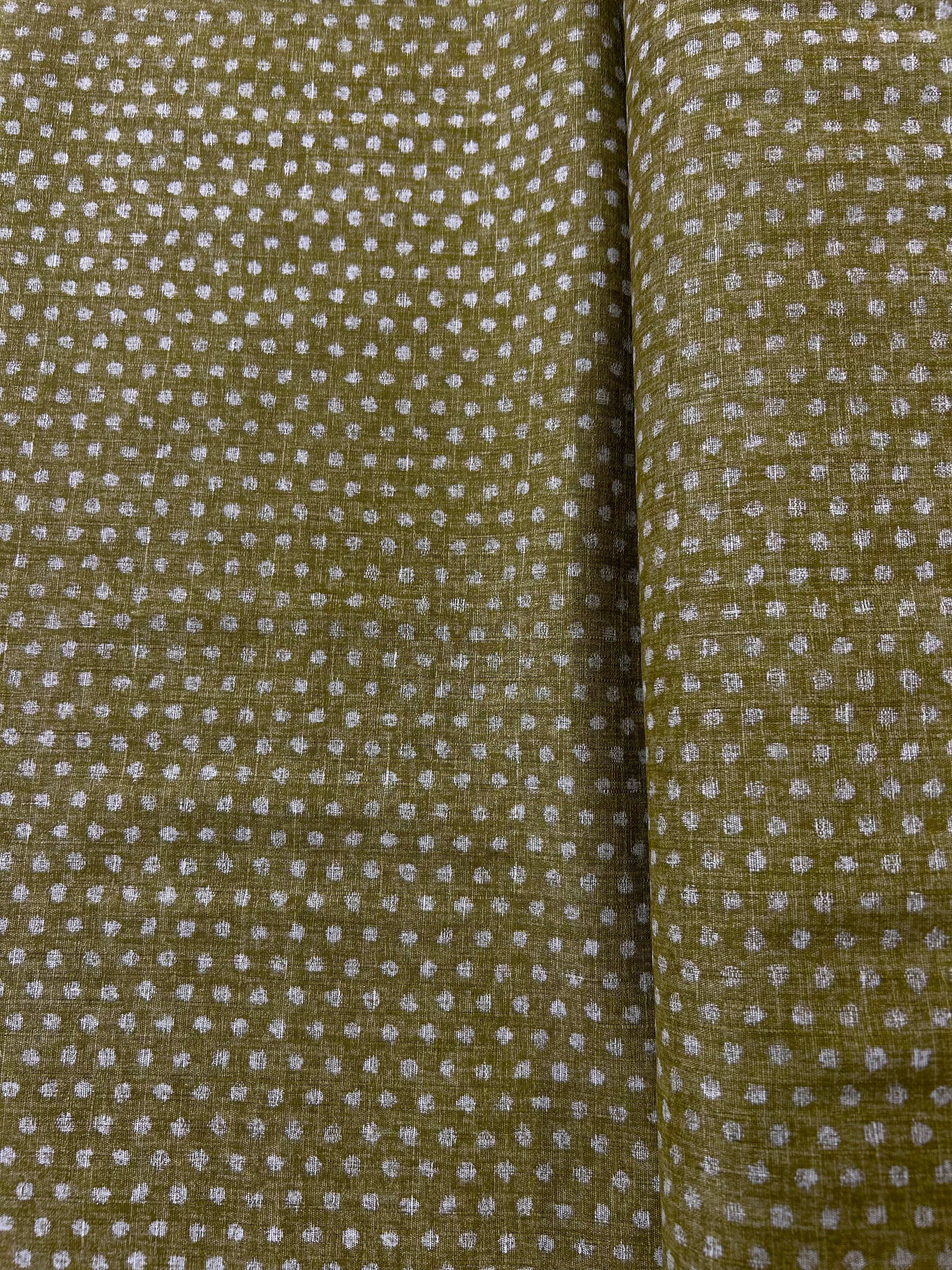 These Morikiku cotton dobby fabrics from Japan are beautiful and sturdy with a lovely polka dot print. These fabrics have a nice weight, are double-sided (back side is plain color), and have a wonderful dobby texture. Great for pants, shirts, skirts, or light jackets. We have three beautiful colors: a light red with white dots, dark navy with white dots, and olive with white dots.