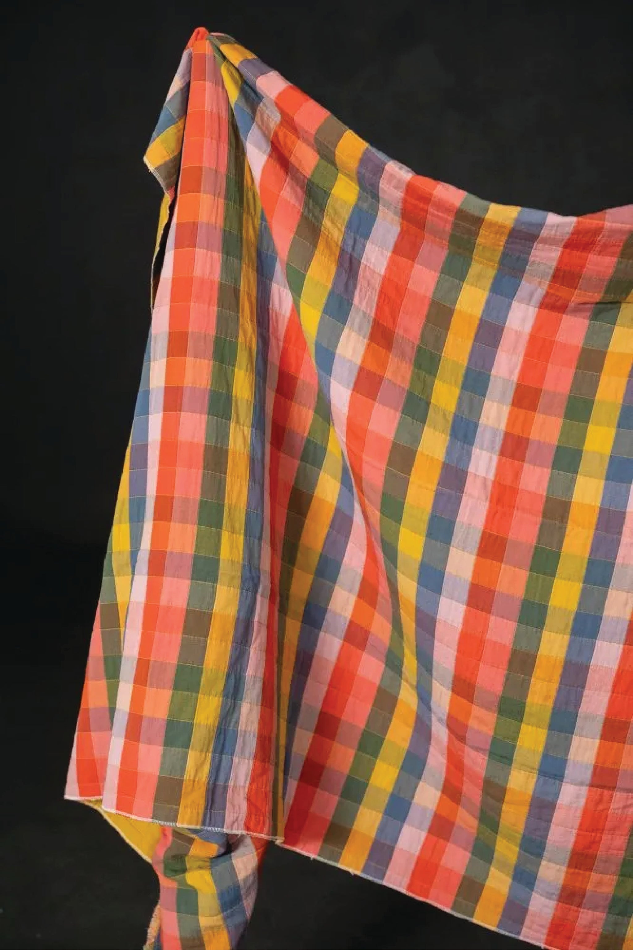 This layered cotton has a jacquard weave that gives it a quilted look and feel. A stunning fabric that is bold and colorful with a pattern of checks in yellow, orange, blue, purple, and pink.
