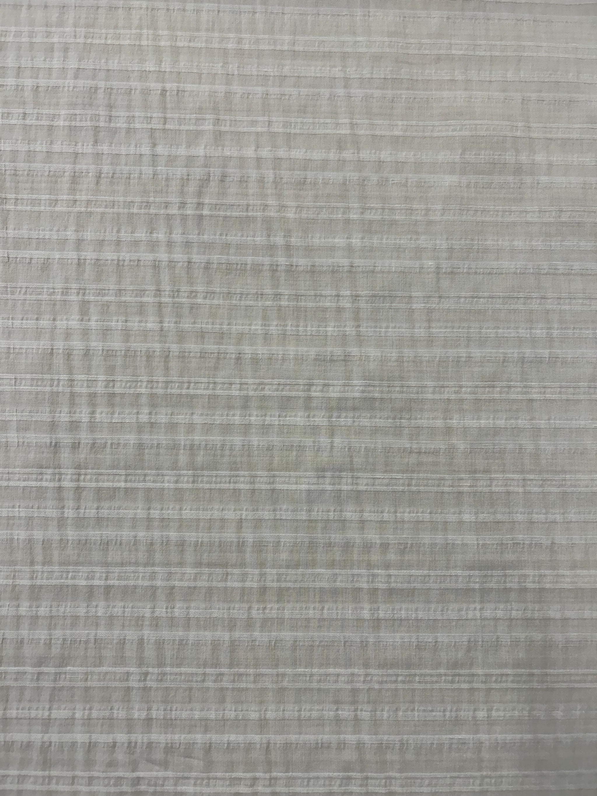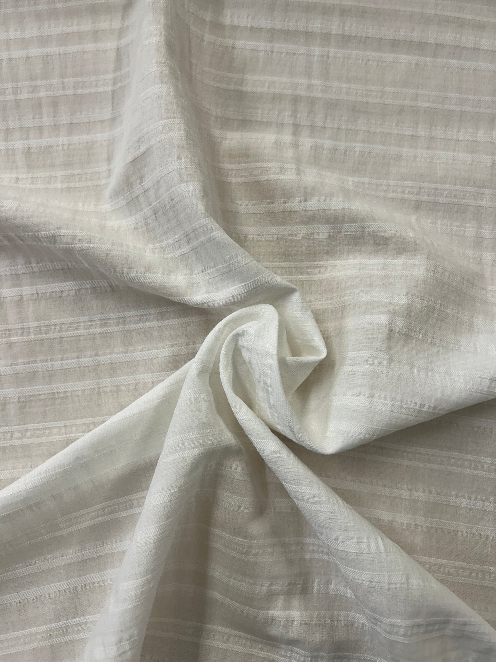 This luxurious and beautiful Italian cotton-linen jacquard has a soft, airy look with subtle horizontal stripes woven directly into the fabric. The translucent fabric has a texture that feels lightly crinkled and organic, giving it a relaxed, natural elegance that works beautifully for breezy garments. Use it for shirts, dresses, skirts, lightweight pants, and shorts.