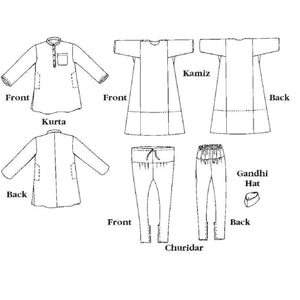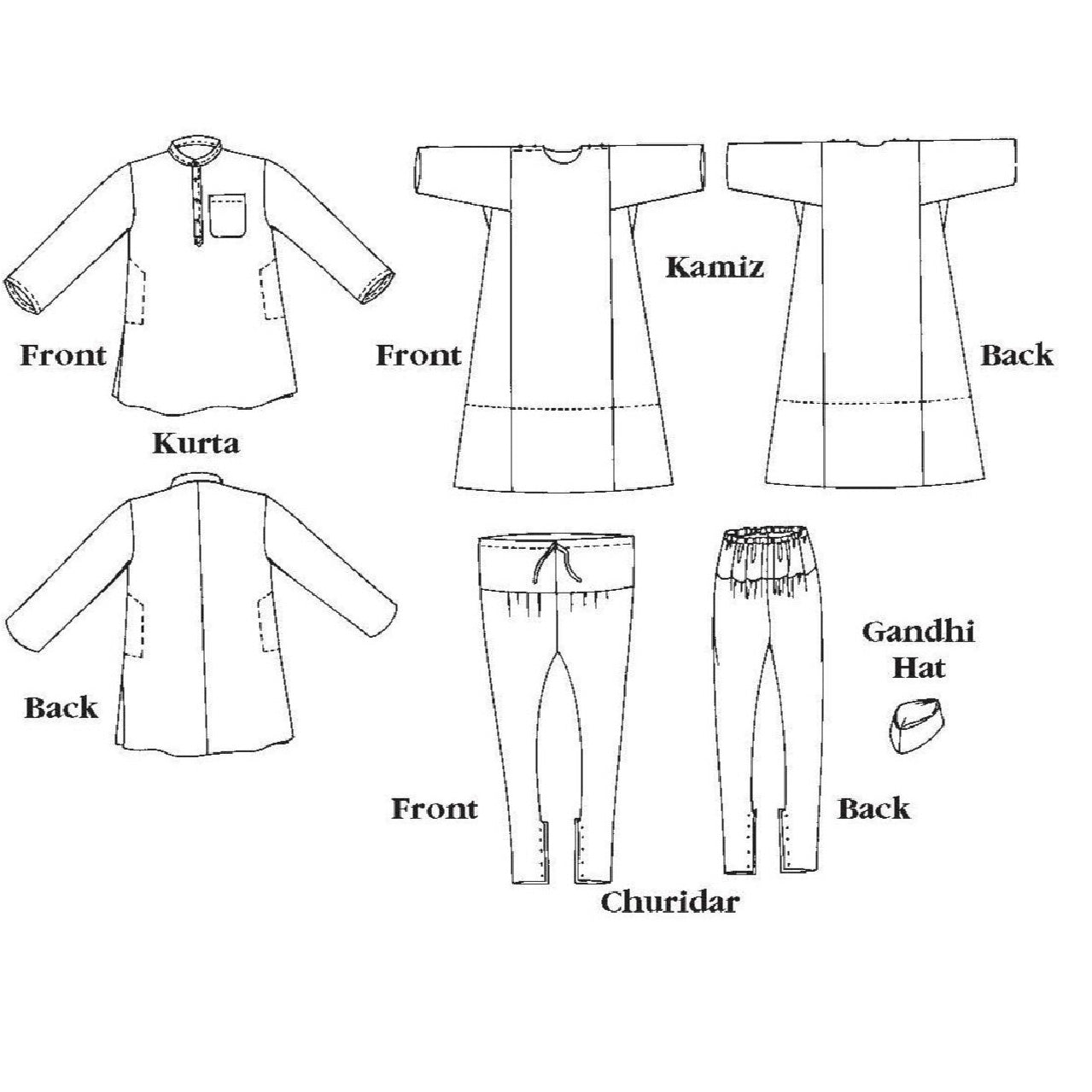 Suggested fabrics: For the Kurta, choose any shirting fabric from gauze to flannel. For the Kamiz and Churidar, choose light to medium-weight cottons, silks, or synthetics; lightweight wool. For the hat, choose medium-weight cotton, silk, or wool; decorative weaves or brocade.