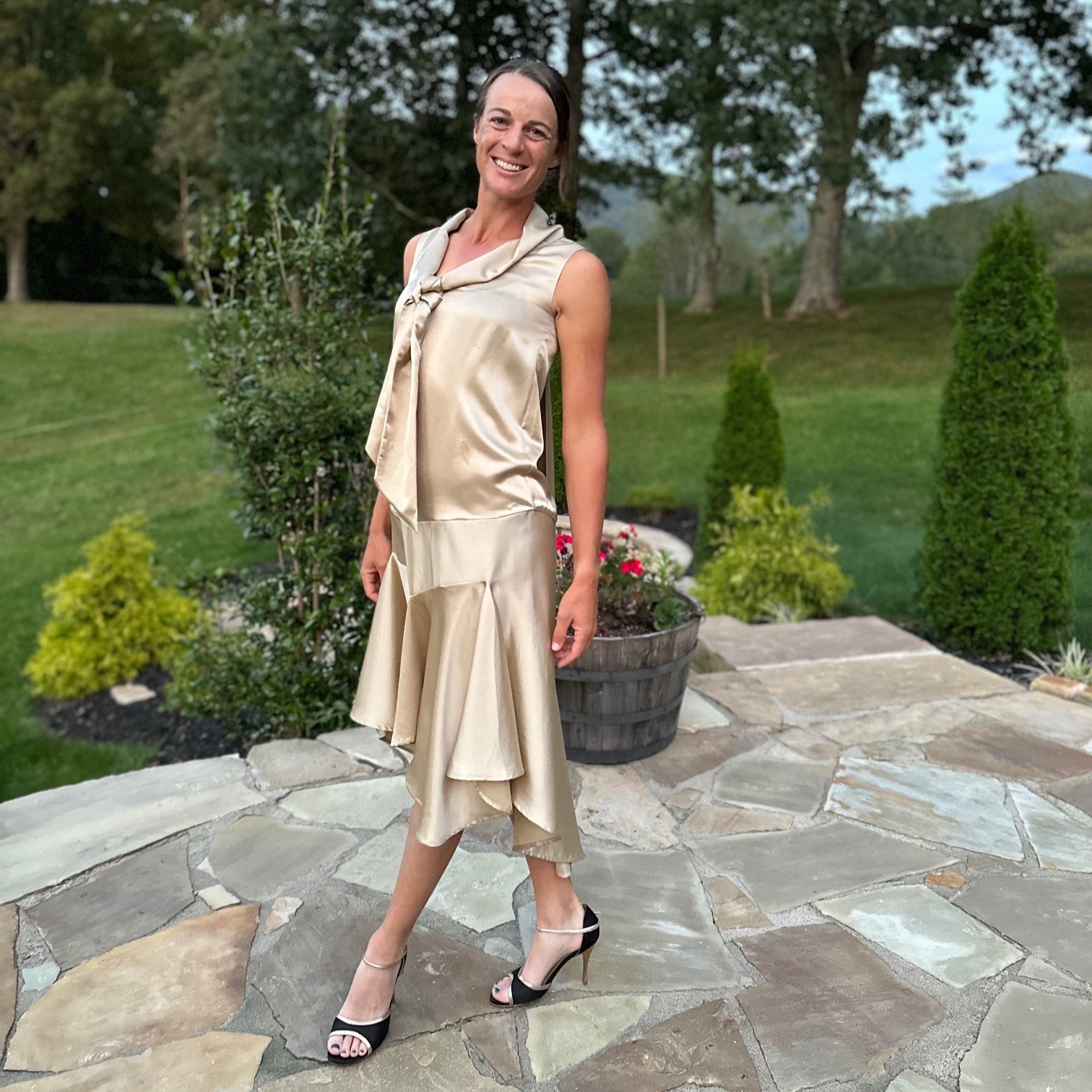 The unusual construction for the Tango Dress adds to its dramatic impact. A long sleeveless bodice hangs straight to the hips where it meets the skirt made of two uniquely cut sections. The back of the skirt falls away from a front hip panel that echoes the V neckline. Another shallow V hugs the body at the bodice/skirt seam in the back. The skirt front fits into the back and hip panel ingeniously.